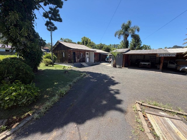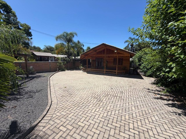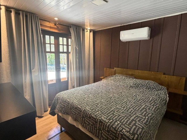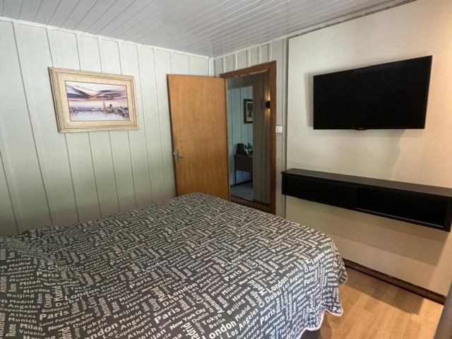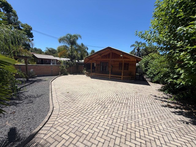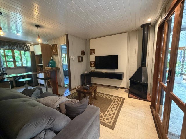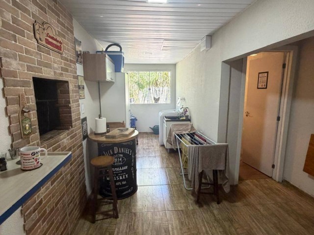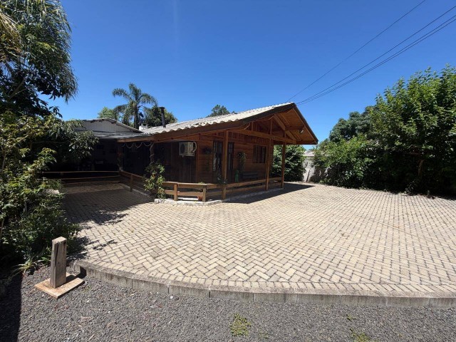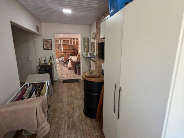 • Casa de madeira: 2 quartos, 1 escritório, 1 banheiro, cozinha, churrasqueira na área interna, sala, lavanderia, varanda, garagem, com acesso portão eletrônico, canil, pátio cercado.
